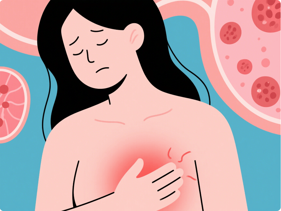 然而,接下来的几个月,杜女士开始察觉到异常。每次生理期临近,双侧乳房都会胀痛,仿佛被无形的绳索勒紧,直到经期结束后才逐渐缓解。