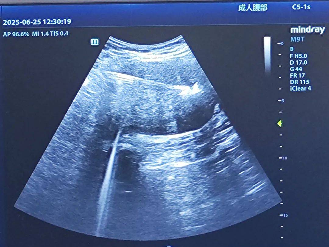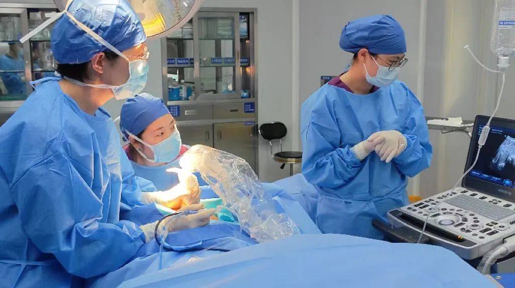 经过一系列严谨的术前检查,曹主任带领团队为汪女士实施了超声引导下经皮子宫肌瘤微波消融术, 在超声的精准导航下,肌瘤被逐一“击破”。