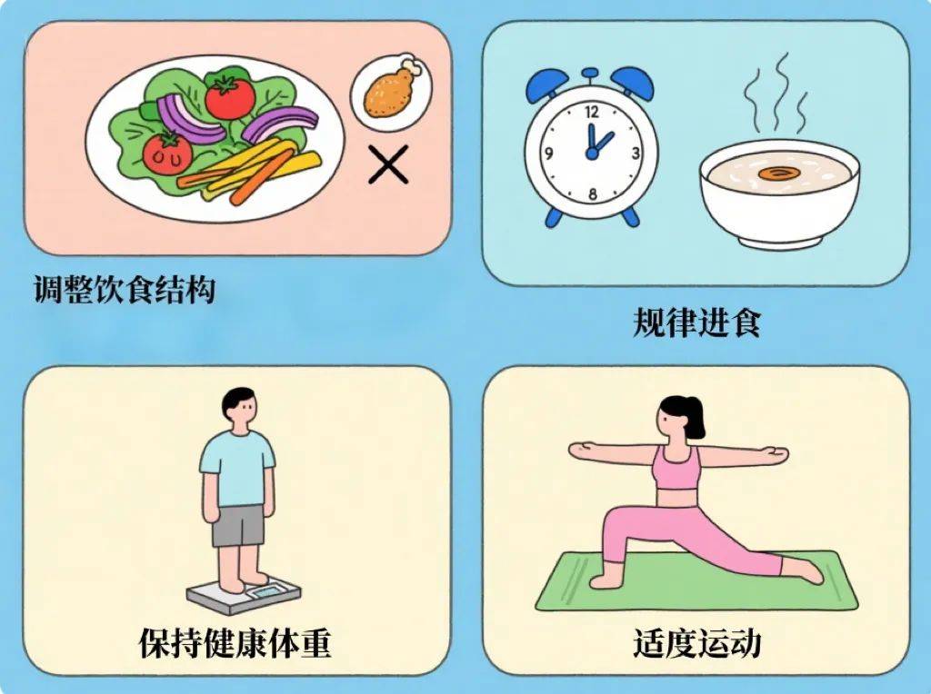• 生活方式重塑: 调整饮食结构(减少油腻、高胆固醇食物),规律进食,保持健康体重,适度运动。