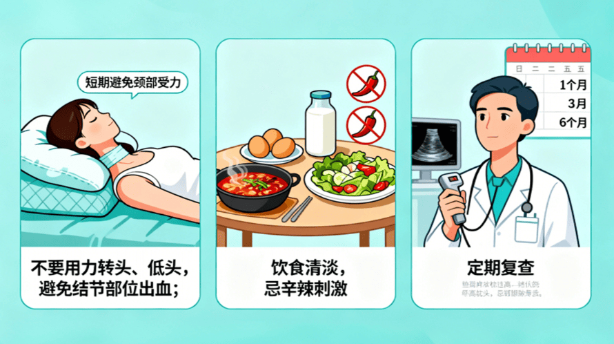 不要用力转头、低头,避免结节部位出血;睡觉时可适当垫高枕头,减少颈部肿胀;