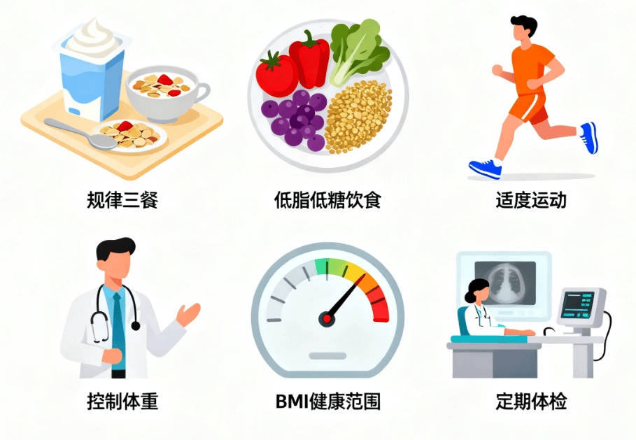 减少油炸、甜食摄入,多吃蔬菜水果、全谷物,控制胆固醇摄入。