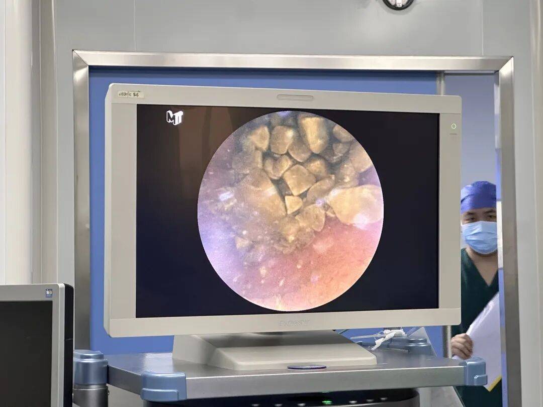 手术当天,胡院长带领团队为高先生实施了新式微创保胆手术。术中通过胆道镜仔细探查,发现里面的结石“满满当当”,团队用专业器械将结石逐一取出。
