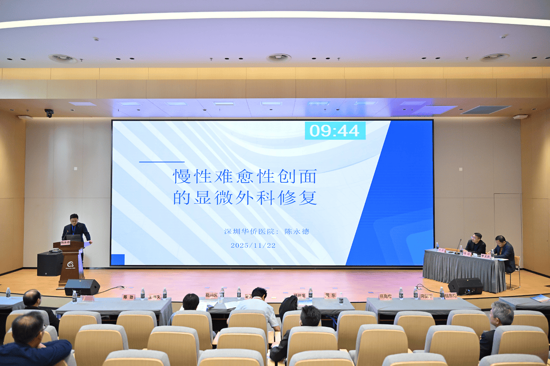 陈主任围绕慢性难愈性创面的临床特点与修复难点,系统介绍了显微外科技术在创面修复中的综合应用策略。随后,他结合典型病例图像资料,详细讲解了各类皮瓣移植、复合组织瓣移植等显微修复方式的选择原则与技术要点,并针对不同部位、不同组织缺损类型的修复方案进行了深入剖析。陈主任对复杂病例的精准研判与技术创新应用,赢得了现场专家的高度认可,充分展现了深圳华侨医院国家临床重点专科手外科的实力与学术积淀。