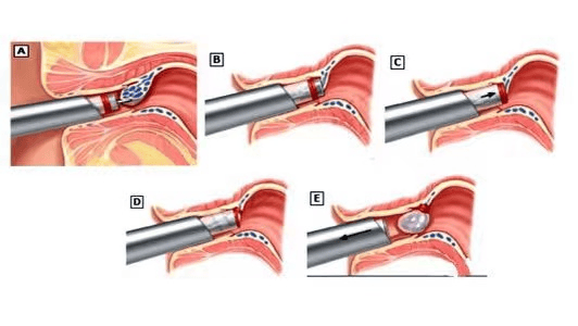 这种方法是将特制的自动套扎器,将弹力线套扎于内痔的基底部,通过弹力绳持续紧缩,阻断痔的血供,使之产生缺血、萎缩、坏死、逐渐脱落,创面组织修复后愈合。