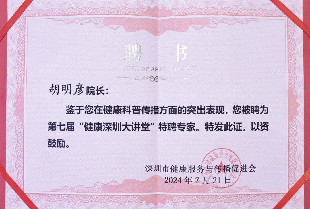 讲座现场,深圳市健康服务与传播促进会陈宇琦会长为胡明彦院长颁发了“健康深圳大讲堂”特聘专家的聘书,希望胡院长能为市民带来更多健康科普知识。