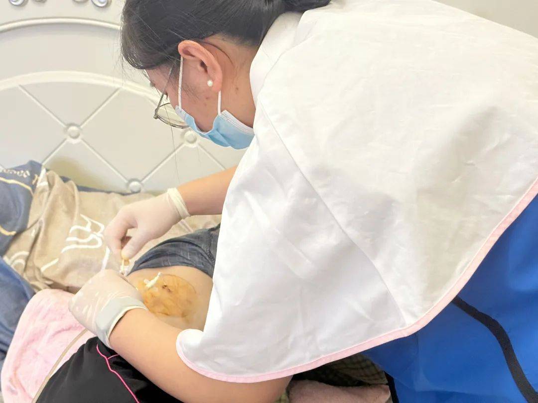 护理部主任接到秦阿姨家属的护理服务需求后,即刻安排专科医护人员准备好引流袋和换药物品,按照约定时间来到秦阿姨家中,为其更换引流口敷料及引流袋。