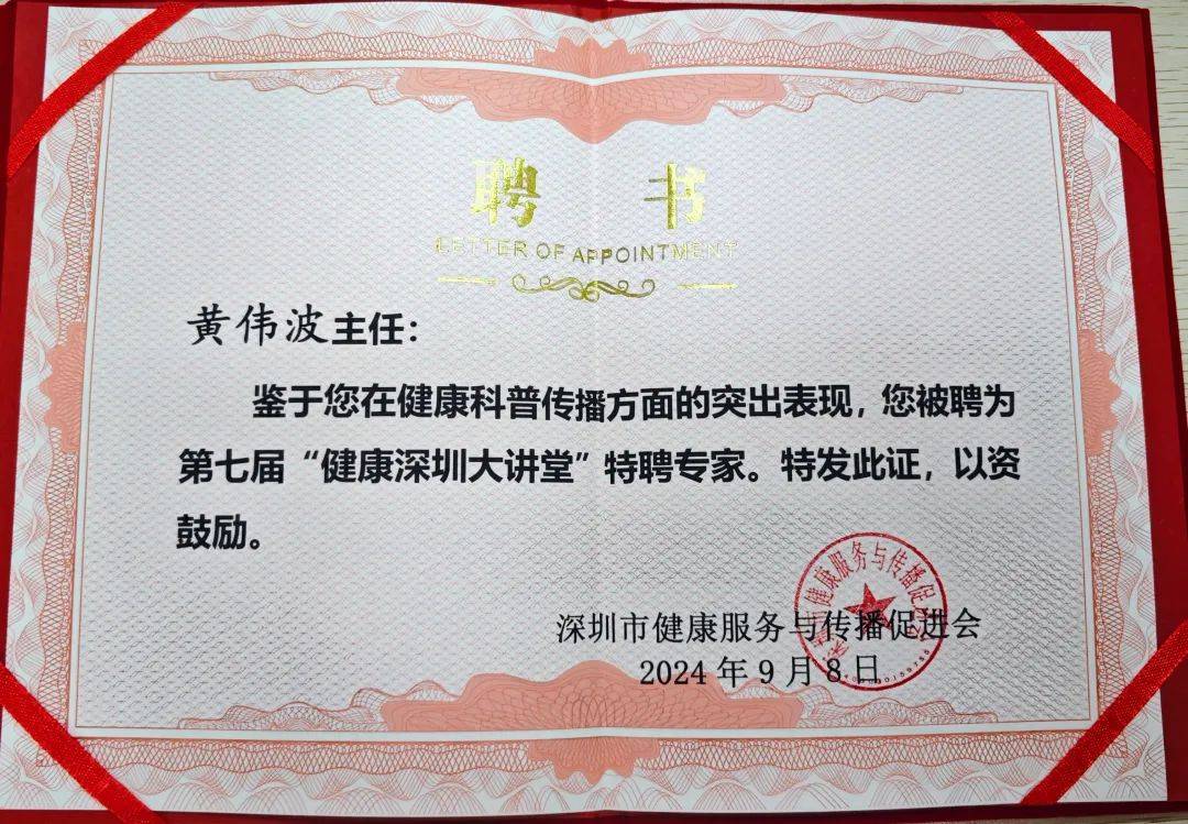 讲座现场,深圳市健康服务与传播促进会陈宇琦会长为黄伟波主任颁发了“健康深圳大讲堂”特聘专家的聘书,希望黄主任能为市民带来更多健康科普知识。