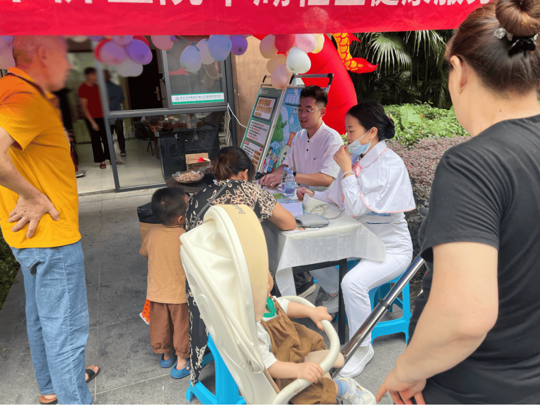 一大早,工作人员便在健康服务中心的大厅内挂满了彩色气球,餐桌上摆放着茶水、水果、花生和瓜子供活动现场的居民们享用。大厅外的彩虹门增添了节日的喜庆气氛,而遮阳棚则早早地搭建在甬道上,为前来参加义诊的居民提供便利。