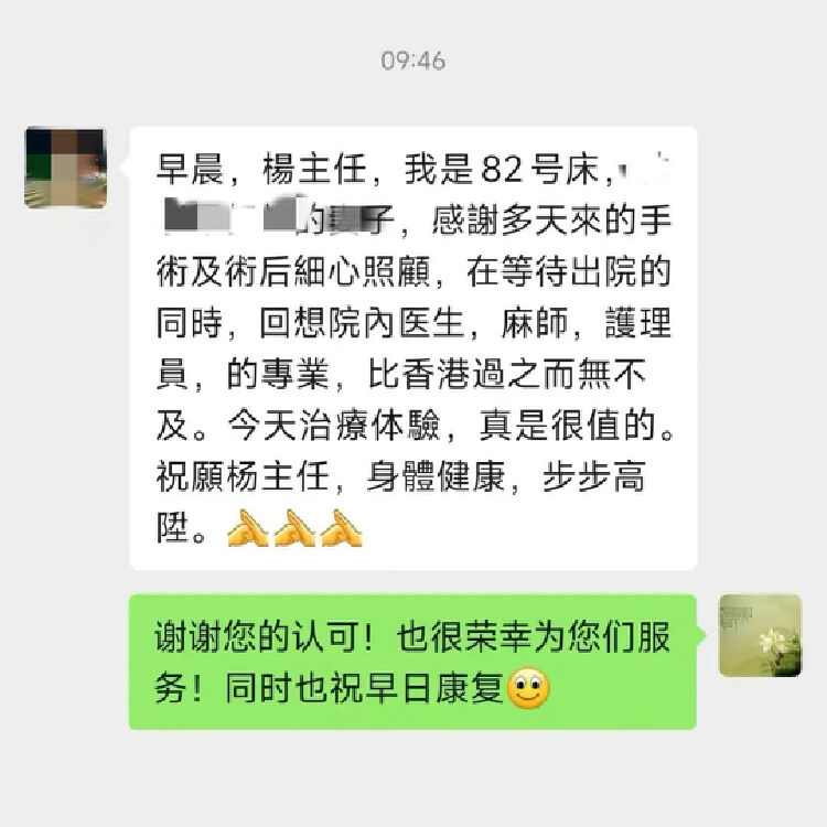 术后,郑爷爷恢复很好,他对医护人员表达了深深的感激:“真是太感谢你们了,感谢你们的精湛医术和精心照护!”出院当天,郑爷爷的家人也在微信上向杨言炜表达了真诚的感谢。