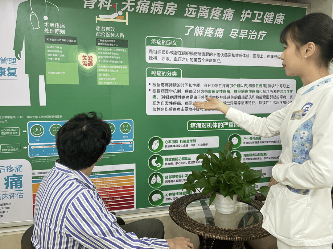 疼痛是骨科患者最常见的症状之一,也是患者术前、术后产生心里恐惧的重要原因。深圳华侨医院骨科病区也是“疼痛专科病区”,护士长对全体护士进行疼痛护理专科培训,科室护士熟练掌握疼痛评估方法,准确、及时地评估患者疼痛程度,制定疼痛护理程序,提前干预,给予“一对一”的心里疏导和支持,充分体现个体化“专科”护理。