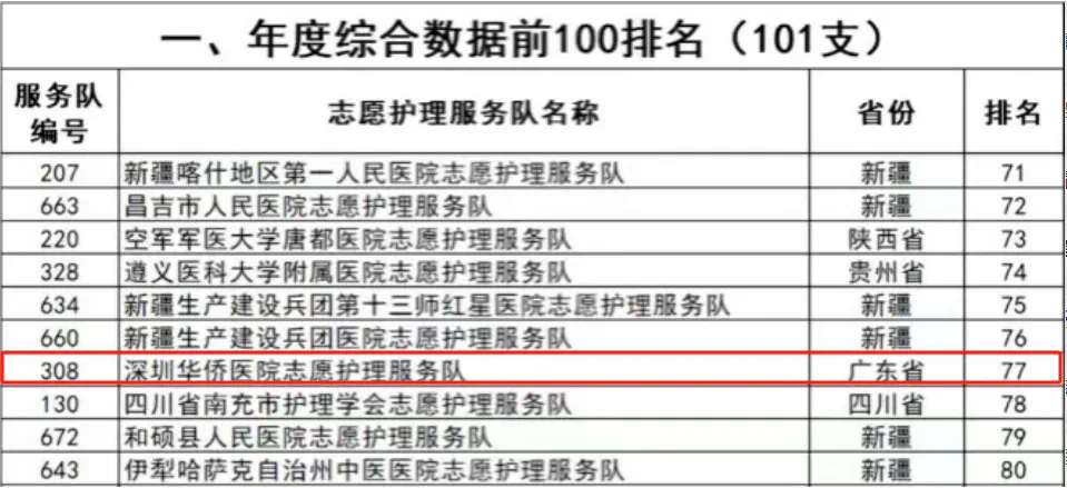 在全国1083支志愿护理服务队中,深圳华侨医院志愿护理服务队凭借卓越表现脱颖而出,综合数据在全国排名第77位,广东省排名第2位。