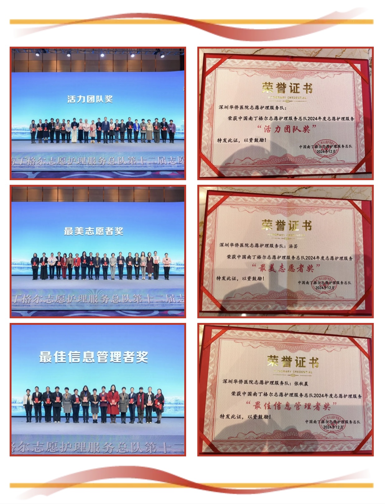 其中深圳华侨医院志愿护理服务队荣获三项重要荣誉:团队获得“2024年度志愿护理服务活力团队奖”;领队汤芸荣获“最美志愿者奖”;通讯员张秋晨荣获“最佳信息管理者奖”。