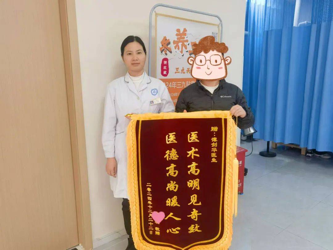此外,中医科团队中的另一位谭剑华医生也以其专业实力得到了患者的认可。一位产后45天、因乳汁淤积导致急性乳腺炎并发烧两天的患者,慕名来到中医科就诊。谭医生接诊后,运用中医适宜技术为患者进行乳腺疏通治疗。仅一次治疗,患者的疼痛便显著缓解;三天后,患者彻底康复。原本计划因乳腺炎停止母乳喂养的母亲,得益于谭医生的精湛医术,不仅恢复了健康,也确保了婴儿能够继续享用母乳。患者深感欣慰,特意送上锦旗,对谭医生表达了由衷的感谢。